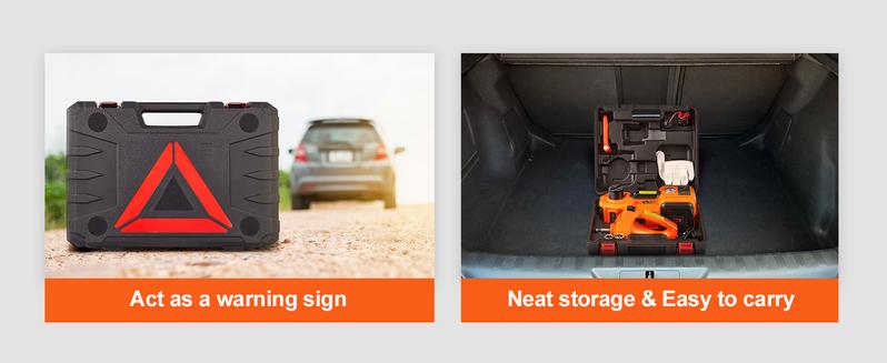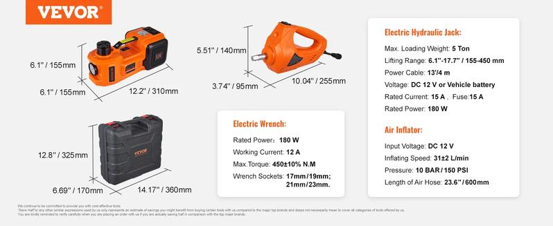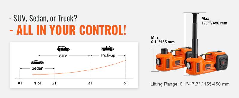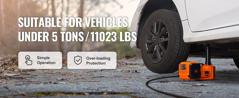 About this item·Powerful Electric Car Jack: Lifting capacity: 5.0 tons/11023 lbs. Lifting Range: 6.1''-17.7" / 155-450 mm. This electric car jack kit is a lifesaver during roadside emergencies and can be used for at-home garage repairs. It matches all autos, sedans, SUVs, trucks, or vehicles that suit its capacity.·Lifted in Minutes: Say goodbye to tedious manual operations. Our electric jack for cars only takes about 2 minutes to reach a maximum height (17.7"). Anyone can easily lift their vehicle out of trouble. When the car jack reaches its MAX. Height, it will automatically stop lifting to ensure security. Note: The jack must be used on flat surfaces.·Quick Tire Inflation: With a tire inflator pump installed in the electric hydraulic car jack, there is no need to worry about a tire-broken emergency in the middle of nowhere. Hidden toolboxes on both sides keep the inflatable tube and inflatable needles for quick tire inflation well organized. Equipped with a tire pressure display, you can monitor the tire pressure while pumping. Your car says thank you!·High Stability & Security: The reliable cross-groove design of the support head effectively stabilizes the jacked car securely. The upgraded hydraulic seal system ensures no oil leaks. Additionally, The built-in LED light is bright enough to use at night, and the pressure relief valve for manual lowering provides enhanced security, even if the power is accidentally cut off.·More Than 1 Way to Charge: The electric hydraulic jack for your vehicle can be powered by a 12V cigarette lighter or car battery and equipped with a long 13 feet power cord so you can place it by the front or rear tire without having to think twice. We also provide you with three spare fuses, and our fuses are TUV, and-certified, so you can use them confidently!Dear Valued Customer,Thank you for choosing our product! Your satisfaction is our top priority. If you encounter any issues or have any concerns, please don’t hesitate to reach out to us before leaving a negative review or requesting a refund. We’re here to help and will do our best to resolve any problem quickly and to your satisfaction.Your feedback is important to us, and we appreciate the opportunity to make things right. Please contact us at TT SHOP, and we’ll respond promptly.Thank you for your trust and support!Best regards,[VEVOR STORE]