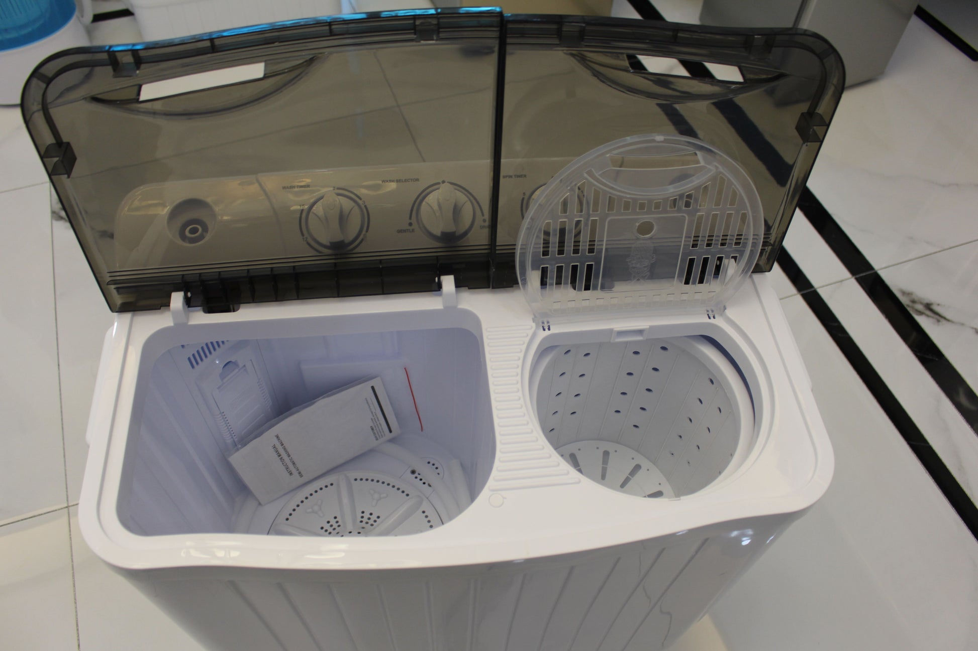 Functional Highlights: This compact 14.33Lbs semi-automatic double-basin washing machine features a dualbasin dehydration function, has a three-level energyeficiency ratine, and is eauipped with mechanical controls for the convenience of top-loading, its eficient desien ensures reliable performance, with a 300-wattwashing power and a 2.5-kilogram dehydration capacity.