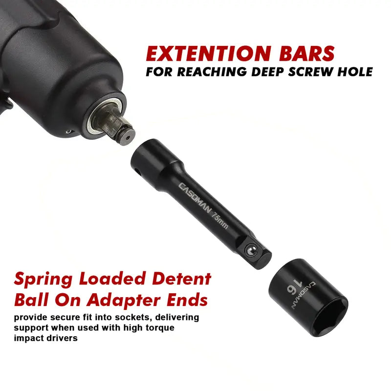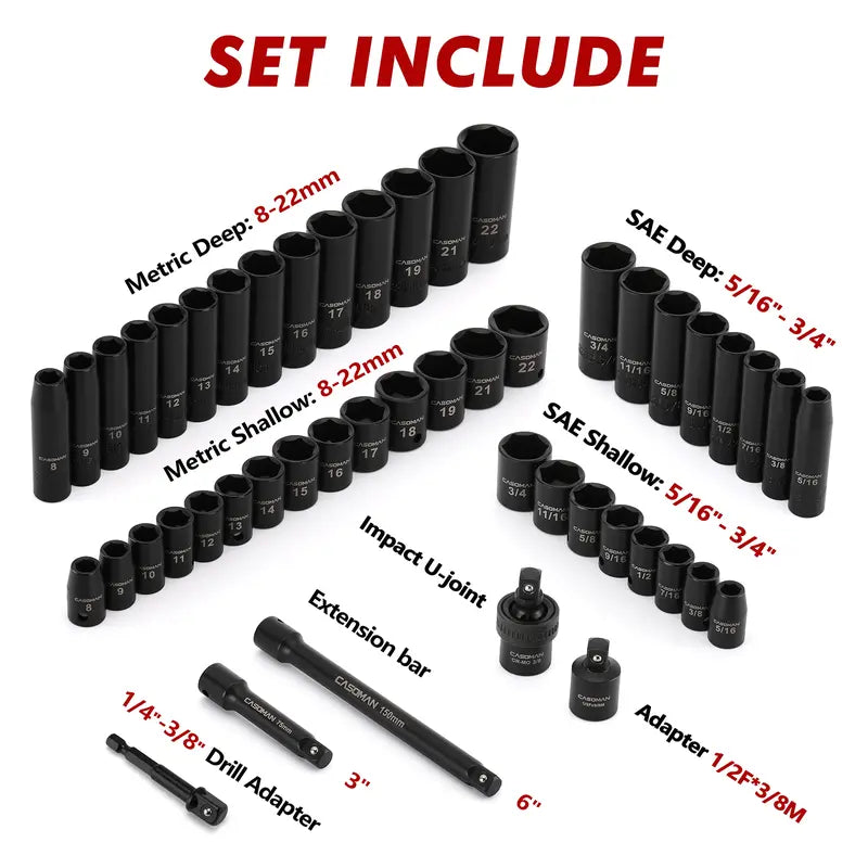 Set include:3" and 6" drive Extension bar 3/8" drive universal joint 1/2F*3/8M Impact adaptor·SAE - Deep: 5/16, 3/8, 7/16, 1/2, 9/16, 5/8, 11/16, 3/4"·Shallow: 5/16, 3/8, 7/16, 1/2, 9/16, 5/8, 11/16, 3/4"·Metric -Deep: 8, 9, 10, 11, 12, 13, 14, 15, 16, 17, 18, 19,21,22mm·Shallow: 8, 9, 10, 11, 12, 13, 14, 15, 16, 17, 18, 19,21,22mm