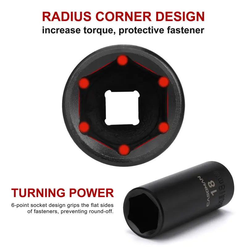 Drive Impact Socket Set, SAE and Metric, 5/16-Inch to 3/4-Inch & 8-22 mm, 6 Point, CR-V, 49 Piece SetDescriptionThis socket set is made from drop forged and heat treated chrome vanadium steel (50BV30) with a corrosion-resistant black phosphate finish, providing the durability for a hard use. Its deep 6-point sockets with chamfered openings and an attachment port compatible with traditional ratchets, high-contrast laser etched with high-visibility markings and hard stamped with size labels.