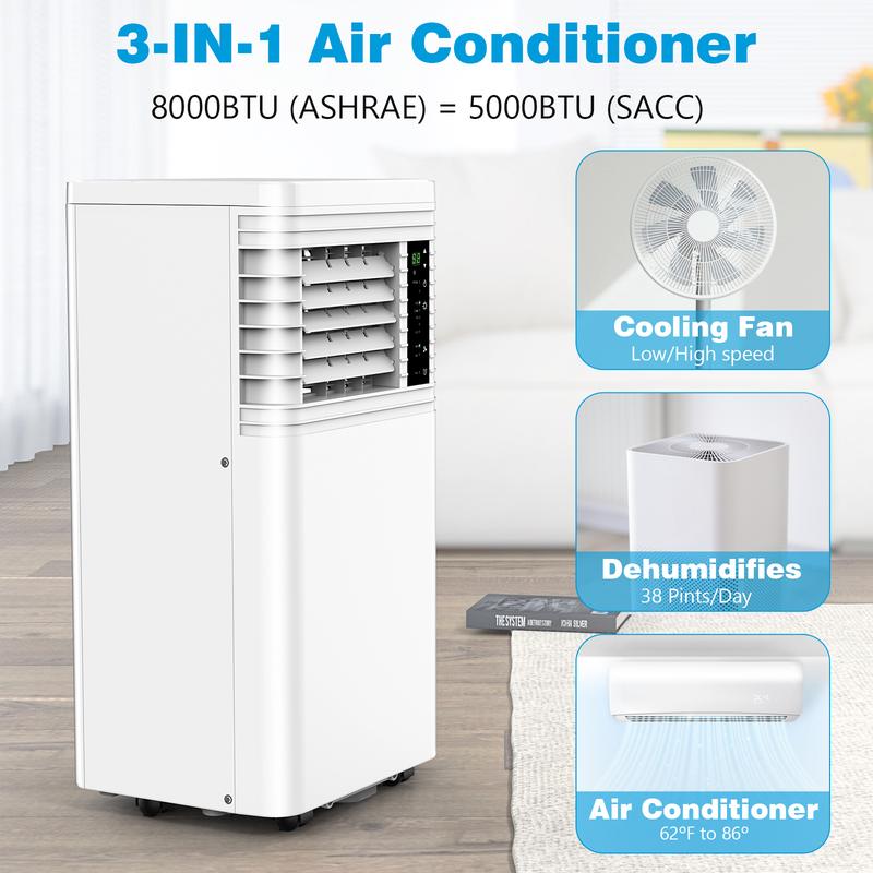 ·【EASY TO INSTALL & PORTABLE】COWSAR Portable air conditioner (11.81 x 13.39 x 27.32 inches) with wheels and side handles can be easily moved anywhere. Perfect for living rooms, dens, bedrooms, storage rooms, garages and apartments. Installation is simple and quick, and all accessories are included.·【3-IN-1 AIR CONDITIONER】COWSAR 3-in-1 multi-function 8,000 BTU air conditioner combines fan, cooling and Dehumidifier modes. Fast and effective cooling rooms up to 350 Sq.Ft.The temperatures between 62°F-86°F. In fan mode, the fan circulates the air in the room. Dehumidifier mode is perfect for humid and rainy days.·【24-HOUR TIMER & SLEEP MODE】COWSAR portable air conditioner is equipped with an efficient compressor to achieve a low noise level (≤54dB), allowing you to have a quiet and cool rest environment. The 24-hour timer switch function is more convenient to use, and you can freely set the switch time to cool your room in advance.·【EASY TO USE & COST-EFFECTIVE】 The air conditioner's LED touch screen is intuitive and easy to operate. When you are lying in bed or on the sofa, you can operate the device with the remote control. Our portable air conditioners use less power, helping to save energy and reduce electricity bills, making them ideal for many homes.