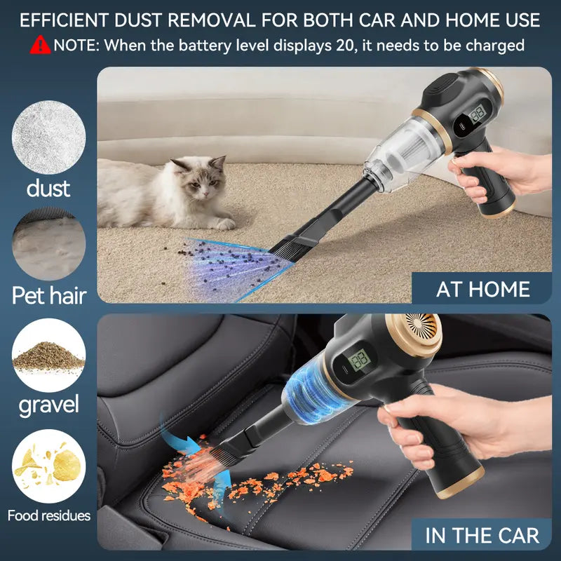 The portable car vacuum cleaner features an advanced motor with a maximum speed of 50,000 RPM.The built-in 4000mAh battery comes with a protective plate to ensure safe charging and use. When fully charged, the light turns green and it can run continuously for 15-30 minutes. Equipped with a C-cord. 16000Pa vacuum cleaner's powerful suction removes particles as small as 0.3 micron deep from sofas and mattresses, leaving dust where it belongs.【COMPACT AND PORTABLE】: Weighing only 0.81 pounds, this car handheld vacuum cleaner is lightweight and easy to carry and store. Great gift for family, friends, workers, mechanics. The handle is ergonomically designed, you won't get tired of holding it for a long time. Our cordless handheld vacuum cleaner has no wall-mounted vacuum, no bulky or tangled cables, making cleaning easier and more efficient【AIR DUSTER AND VACUUM CLEANER IN ONE】 :You can easily use it to blow away dirt, debris, dust and other particles from the surface of objects, as well as sucking out tiny stubborn dirt hidden in keyboards, nooks and crannies. Vacuums on the front and blows on the back. Please note that the different nozzles correspond to the different connections on the front and back of the vacuum cleaner.【EASY TO CLEAN AND REUSE】: The translucent dirt bowl lets you see the extent of the dirt, so you always know when to empty it. The washable bin and Hepa filter can be cleaned directly in the sink. The dry Hepa filter ensures that the cordless vacuum cleaner is sucked up efficiently while keeping dust and dirt out and preventing clogging.【Multi-nozzle and fine cleaning】: The crevice tool allows access to hard-to-reach areas, such as between sofa cushions, as well as for vacuuming in narrow, irregular crevices such as furniture, car upholstery, and small edges. The portable car vacuum cleaner also comes with a variety of removable brush head nozzle accessories, perfect for helping you deep clean cars, computers, cameras, electronics, air conditioners, sofas, windows, pets, plants and more,