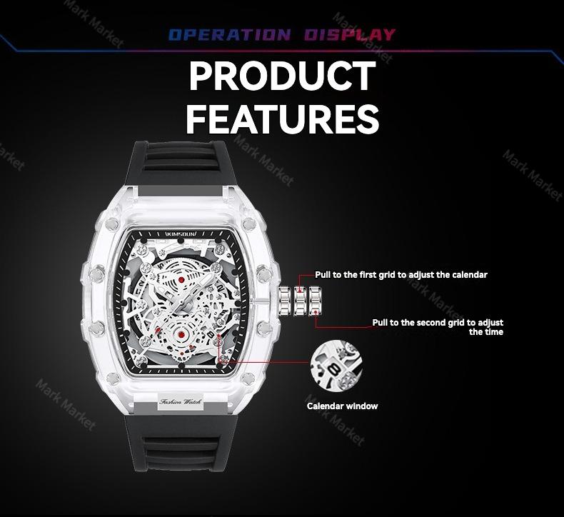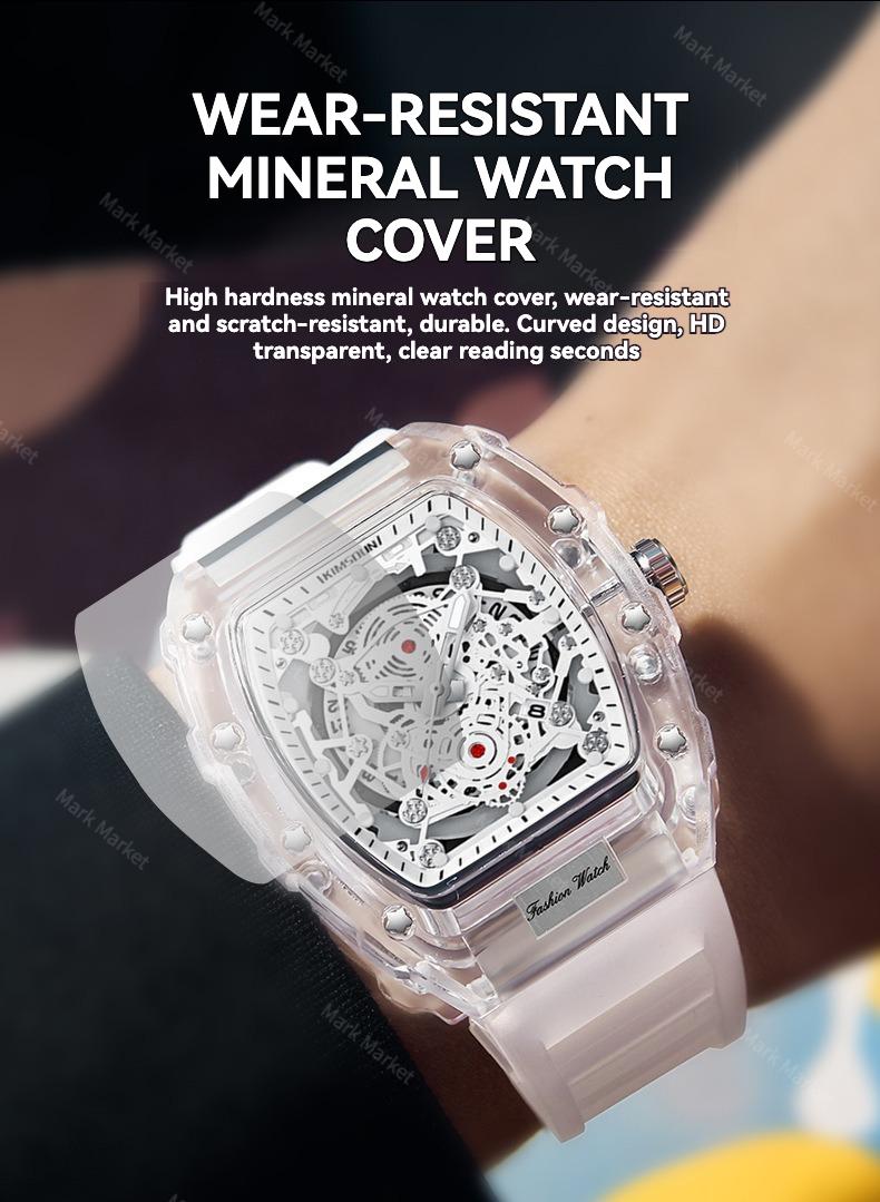 Men's Luxury Barrel-shaped Transparent Waterproof Quartz Watch·Elevate your style with the Men's Luxury Barrel-shaped Transparent Waterproof Quartz Watch, designed for both outdoor adventures and everyday wear. This watch is perfect for back to school, parties, daily use, and fall, making it a versatile addition to your collection.·Key Features:·Barrel-Shaped Design: Offers a unique and stylish look, adding a touch of flair to any outfit.·Transparent Watch Face: Provides a clear view of the time, making it easy to read and adding a modern touch to your watch.·Waterproof: Suitable for various activities, including outdoor adventures, ensuring your watch remains functional in wet conditions.·Quartz Movement: Offers accurate timekeeping, making it reliable for everyday use.·Ideal for Various Occasions: Perfect for back to school, parties, daily wear, and fall, making it a versatile accessory for any occasion.·Perfect Gift:·This watch makes an ideal gift for birthdays, adding a touch of elegance to any celebration.