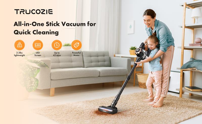 ·[LED DISPLAY & DE-TANGLE DESIGN] With this lightweight cordless vacuum in hand, you can keep every surface in your home fresh and spotless. It features an easy-to-read LED screen, allowing you to monitor the status of the stick vacuum cleaner at any time. The V shape de-tangle floor brush can lift all the long hair and dirt from carpets or hard floors.·[8-IN-1 MULTIFUNCTIONAL VACUUM] Cordless and weighing less than 3.3 pounds, Trucozie T350 is effortless to maneuver and handle, without putting strain on your back. Equipped with a 2-in-1 brush and a sofa brush, it can be transformed into a handheld vacuum in seconds. Now, curtains and cobwebs are no longer beyond reach. Use the included crevice tool to suck up crumbs on car seats.·[UP TO 45 MINS RUNTIME BATTERY] Equipped with a rechargeable 7*2200mAh battery pack, the Trucozie wireless vacuum cleaner can clean an entire house on a single charge. Energy-saving Mode:45mins, Mid:25mins, Max:20mins. (Measured at the hand vacuum in standard mode.) NOTE: the battery should be installed when in use.·[5 STAGES FILTRATION] With the 5 stage advanced filters system, the vacuum cleaner cordless efficiently captures 99.99% of dust particles as small as 0.1um to avoid secondary pollution. We recommend cleaning the HEPA filter every 2-3 weeks and replacing them every 3 months for optimal performance (2 HEPA filter included).·[LED DETECTS INVISIBLE DUST] The floor brush has 6 LED lights, which can instantly illuminates under furniture, letting no dust escape detection or elimination under your bed frame. With this cordless vacuum for home, you can redefine clean above, under and beyond.·[IDEAL CHOICE] Presented in a sleek and modern design, Trucozie cordless hard floor vacuum cleaner is an captivating addition to any home. It's a cordless vacuum that you can use with ease. Whether for the elderly, busy professionals, or new homeowners, it's a considerate and convenient choice.·[AFTER-SALES-SERVICE] Each Trucozie battery powered vacuum cleaner comes with 12-month protection plan and 24/7 customer service. If you encounter any problems, please contact us via message or email. Homeika-H320