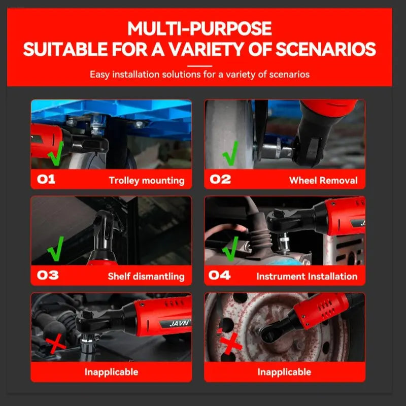 ·【High Torque Capacity】: With a torque capacity of 45NM, this electric right angle wrench is ideal for removing stubborn nuts and bolts in your car repair tasks.·【Easy to Use】: The 3/8" ratchet wrench is designed with an ergonomic handle for comfortable, efficient use.·【Gift】: The electric right angle wrench is a perfect gift for car repair or DIY projects.