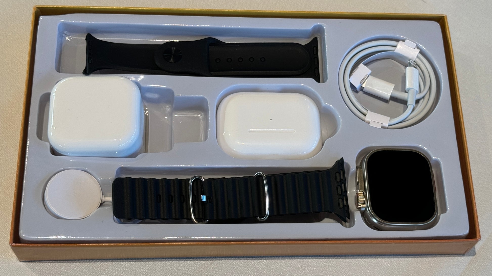 The smart watch kit enhances your technological experience. This kit includes a smart watch Bluetooth headset, a 20W fast charger, a Type-C fast charging cable, an adapter, and audio support. It is highly suitable for iPhone and Android users, being small in size and easy to carry, making it perfect for use when going out. The Bluetooth headset offers a seamless audio experience. These headphones have clear sound quality and are compatible with both iPhone and Android devices. You can stay connected and entertained wherever you go. The 20W fast charger ensures quick charging for your device. The Type-C fast charging cable further improves charging efficiency. Stay charged and ready for action anytime and anywhere. The adapter and audio support This kit comes with an adapter that can be used for multiple purposes. It also supports audio functions and is a multi-functional accessory to meet your technological needs. Stay connected and charged at any time. Product dimensions Product dimensions: 24.5 * 14.5 * 3 cm